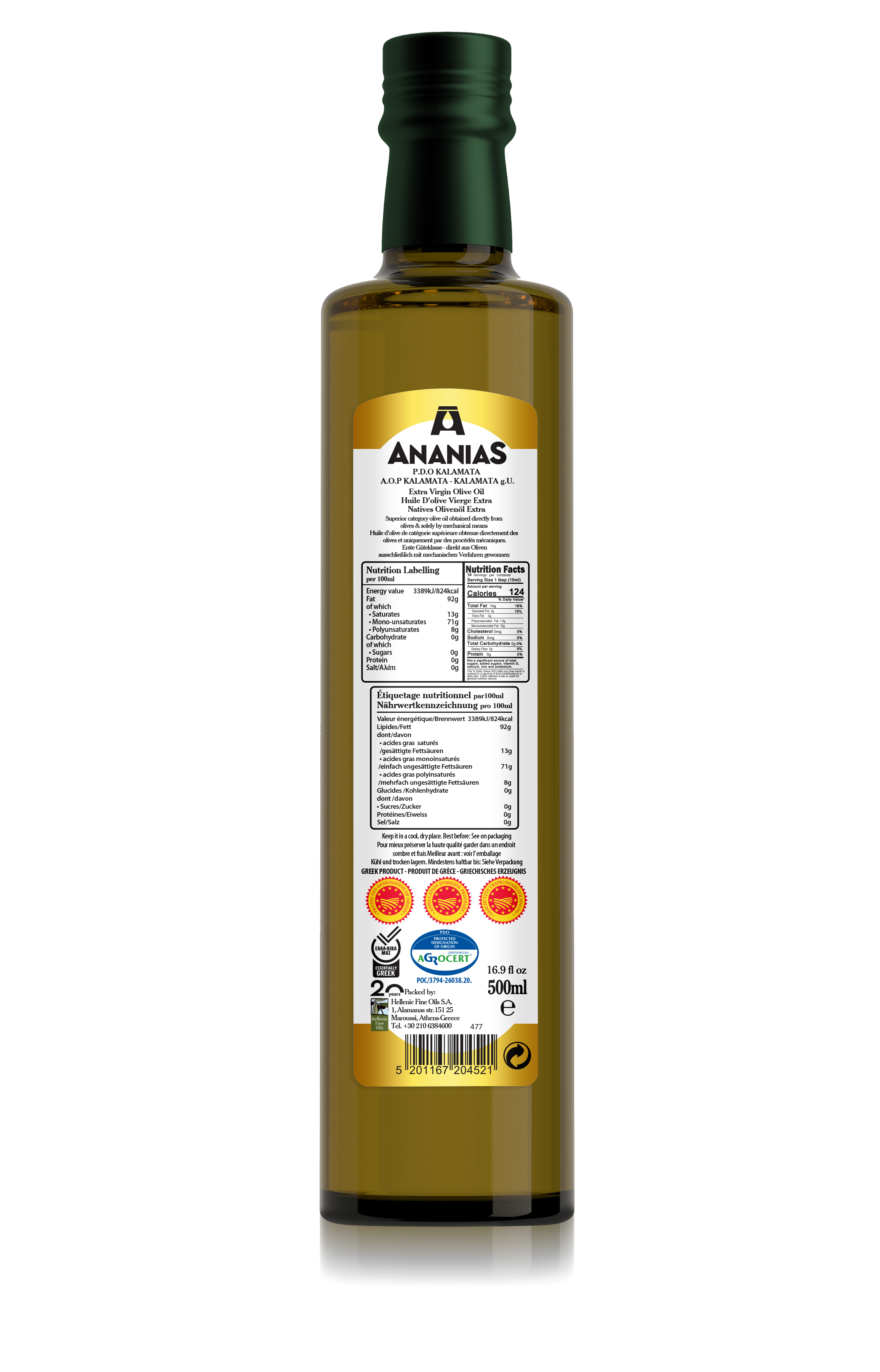 Ananias extra virgin olive oil with Protected Designation of Origin (PDO) Kalamata, comes from olive groves located in the area of Kalamata, in the Southern Peloponnese. This area is well known for the quality of its olive oil in Greece and abroad.